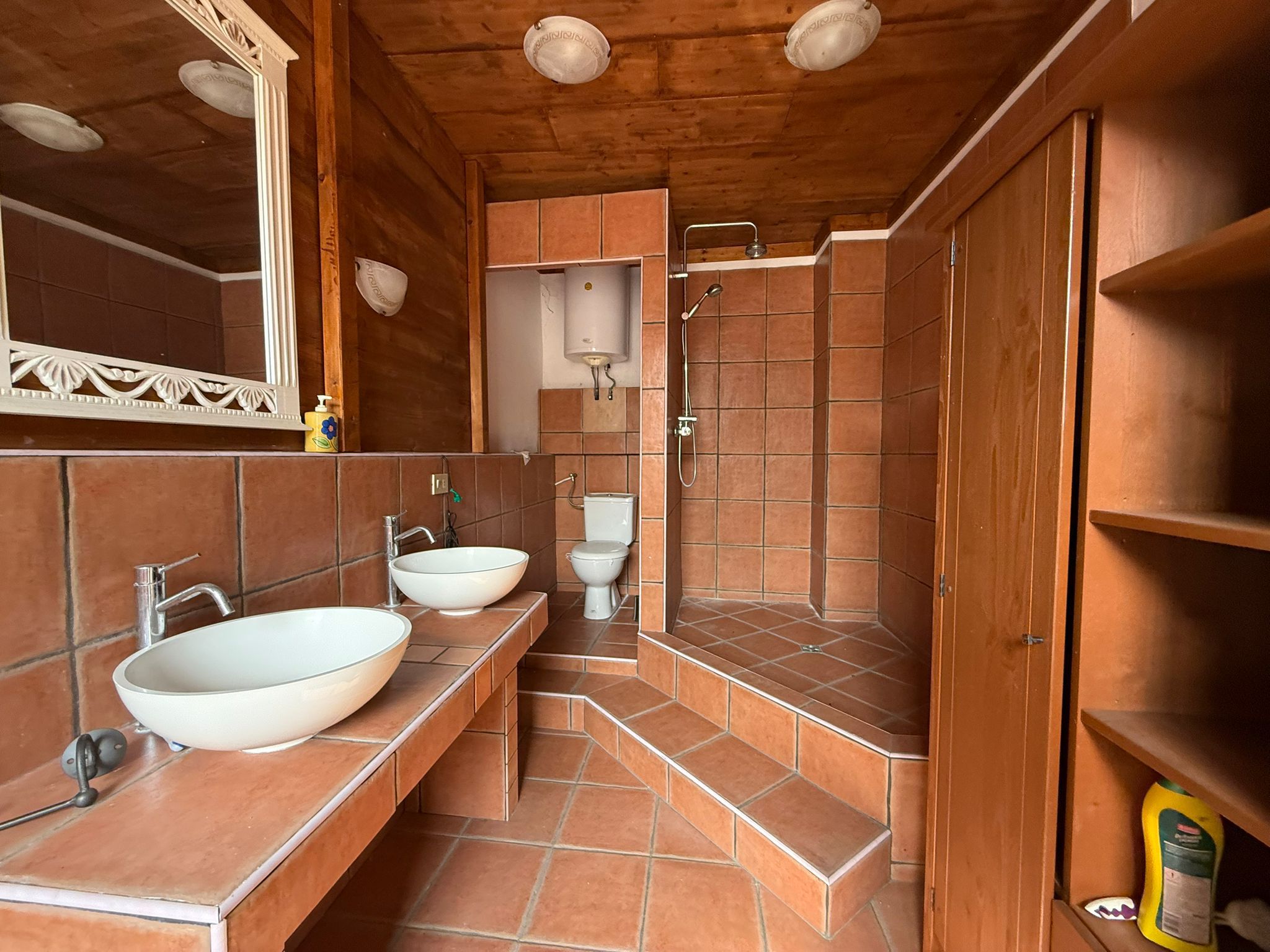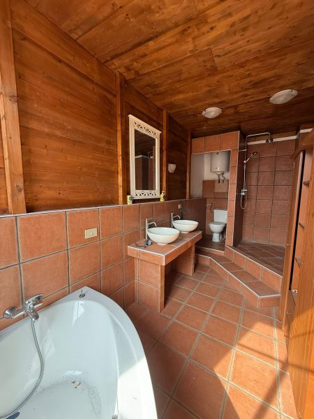 Es sind derzeit 3 Küchen, 3 Wohnzimmer, 3 Badezimmer (mit Dusche sowie Badewanne, teilweise mit Whirlpool), 5 Schlafzimmer, 1 Balkon, 1 Terrasse, 2 Abstellräume sowie ein Kamin vorhanden. Eine Terrasse mit offener Sicht ist gegeben; ein Sauna-/SPA-Bereich ist je nach Konzept ebenfalls sehr gut realisierbar. Ein Garten wäre im Untergeschoss realisierbar (je nach Ausbau-/Gestaltung) und ca.1000m2 Grundstück.Anschlüsse & Heizung: Wasser, Strom und Gas,Internet sind vorhanden, ebenso Kamin und ein Pelletofen. Die Renovierungskosten wurden vom Geometer auf ca. 250.000 € geschätzt.